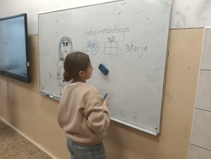 Na zajęciach uczniowie ćwiczyli autoprezentację, ucząc się, jak w prosty i naturalny sposób opowiadać o sobie, swoich mocnych stronach i zainteresowaniach. Wspólnie odkrywali też marzenia oraz klasowe talenty, co często prowadziło do ciekawych rozmów i zaskakujących wniosków. Zajęcia pokazały, że każdy ma coś wyjątkowego do zaoferowania i że warto rozwijać swoje pasje z myślą o przyszłości.